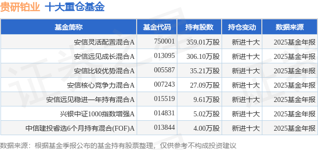 根据2025基金年报公募基金重仓股数据,重仓该股的公募基金共7家,其中持有数量最多的公募基金为安信基金的安信灵活配置混合A。安信灵活配置混合A目前规模为14.78亿元,最新净值3.1675(4月7日),较上一交易日上涨0.31%,近一年上涨60.44%。该公募基金现任基金经理为张竞 梁冰哲。张竞在任的基金产品包括:安信核心竞争力混合A,管理时间为2019年6月5日至今,期间收益率为124.54%;安信比较优势混合A,管理时间为2021年1月15日至今,期间收益率为48.7%;安信平稳合盈一年持有混合A,管理时间为2021年2月1日至今,期间收益率为13.1%。梁冰哲在任的基金产品包括:安信新价值混合A,管理时间为2021年8月30日至今,期间收益率为31.57%;安信聚利增强债券A,管理时间为2022年6月23日至今,期间收益率为23.53%;安信楚盈一年持有混合A,管理时间为2024年6月18日至今,期间收益率为12.12%;安信稳健增益6个月持有混合A,管理时间为2025年7月15日至今,期间收益率为2.41%。
