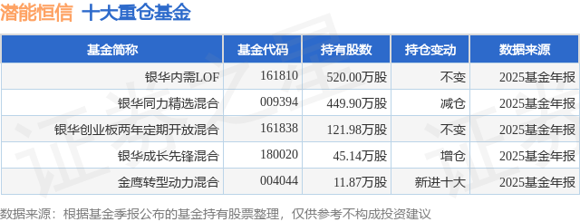 根据2025基金年报公募基金重仓股数据,重仓该股的公募基金共5家,其中持有数量最多的公募基金为银华基金的银华内需LOF。银华内需LOF目前规模为16.85亿元,最新净值5.143(4月8日),较上一交易日上涨4.24%,近一年上涨93.93%。该公募基金现任基金经理为王利刚。王利刚在任的基金产品包括:银华成长先锋混合,管理时间为2019年12月31日至今,期间收益率为53.39%;银华创业板两年定期开放混合,管理时间为2020年8月7日至今,期间收益率为-12.54%;银华同力精选混合,管理时间为2021年4月26日至今,期间收益率为62.92%;